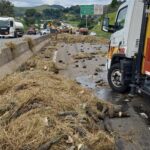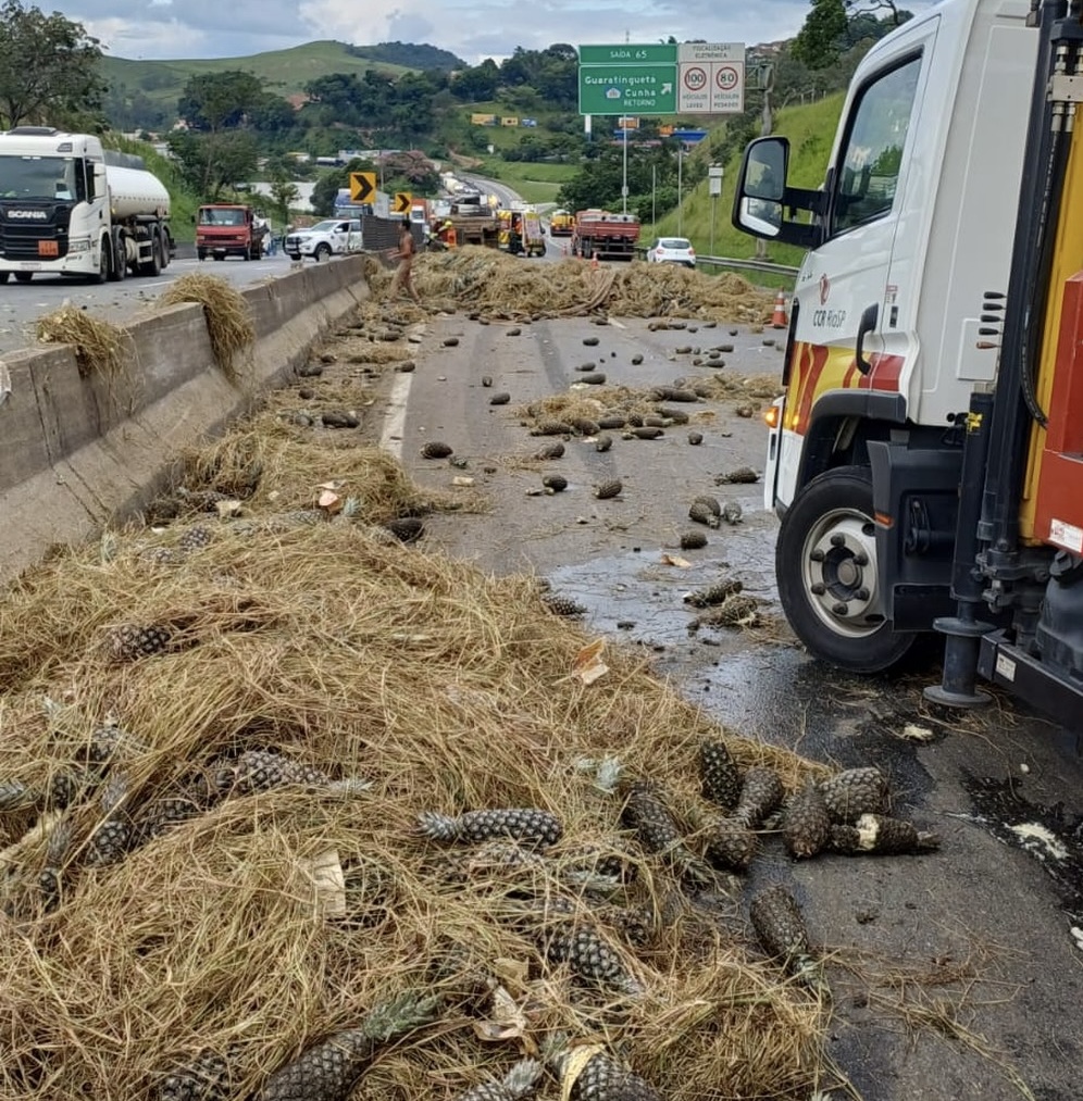 Caminhão com carga de abacaxis bate em mureta e deixa motorista ferido na Dutra, em Guaratinguetá