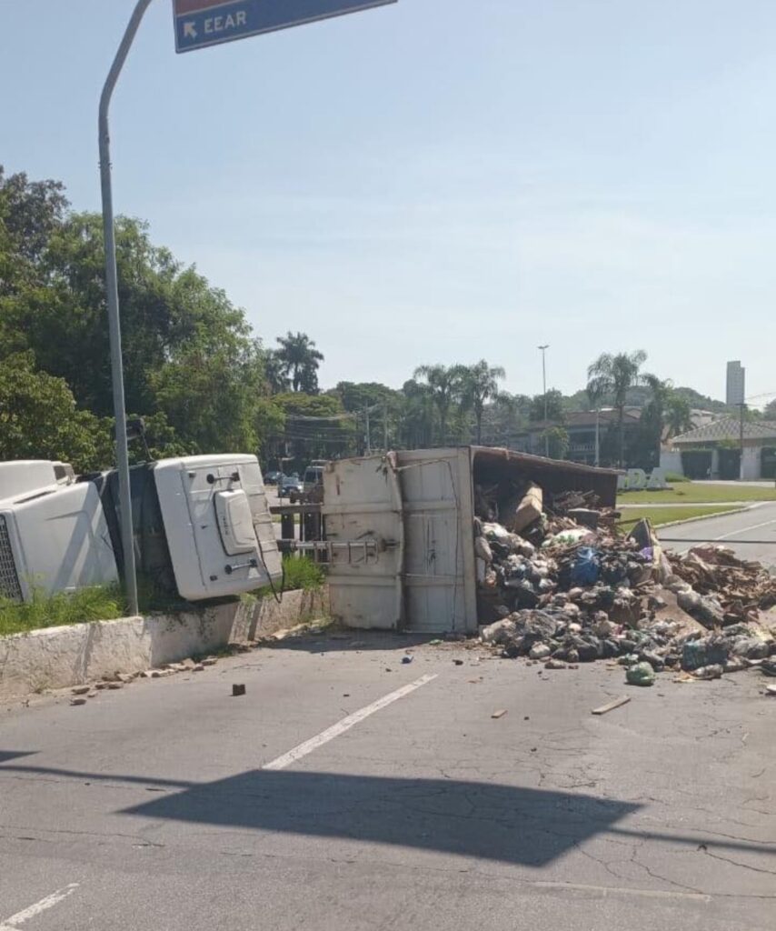Caminhão tomba na subida da ponte Rosinha Filippo e causa interdição em Guaratinguetá