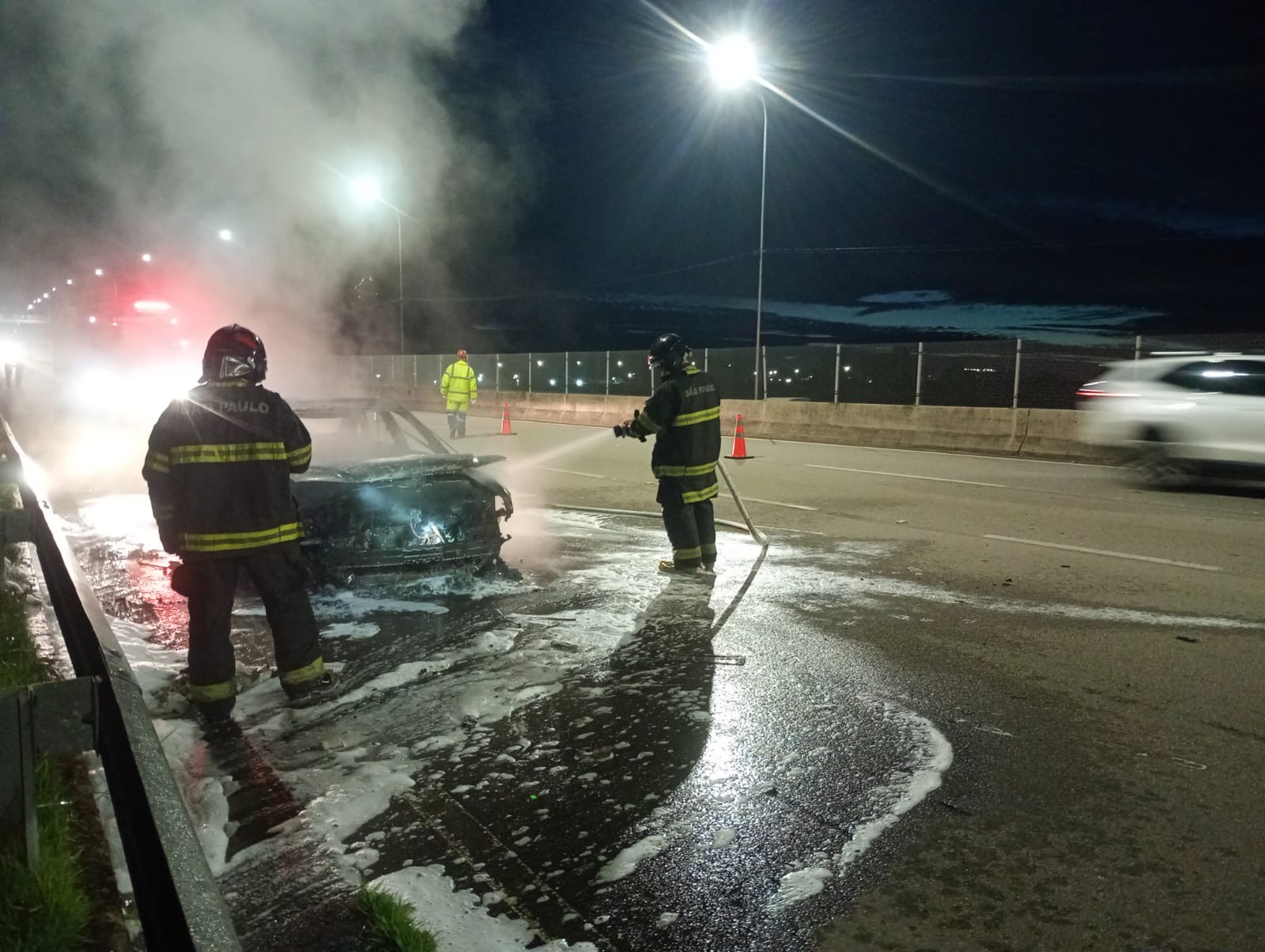 Carro pega fogo na Rodovia dos Tamoios durante a madrugada; ocupantes saem ilesos