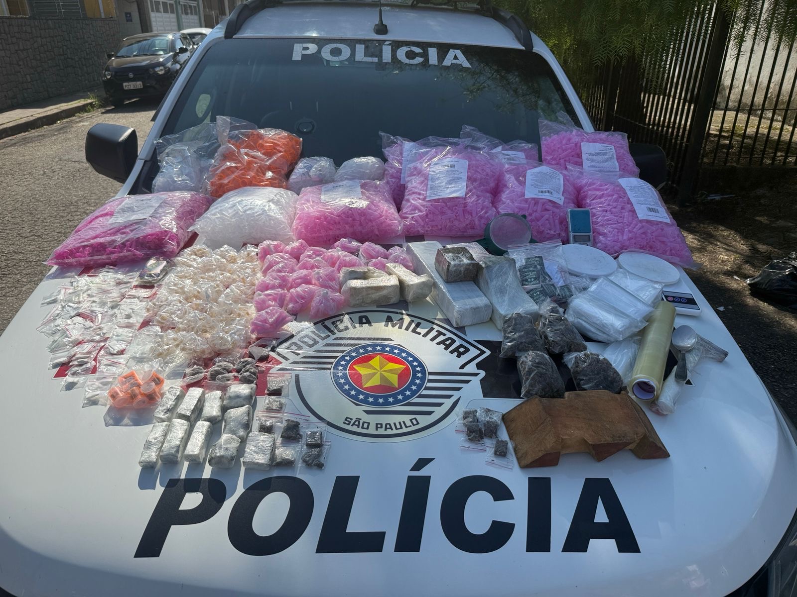 Foram apreendidos aproximadamente 2,320 kg de maconha, 0,830 kg de crack, 0,096 kg de haxixe, 0,110 kg de maconha hidropônica e 0,458 kg de cocaína. Também foram recolhidos 10 mil microtubos (eppendorfs) vazios, 900 envelopes para embalo, três balanças de precisão, uma mesa de corte, um martelo, uma faca, um rolo de filme plástico e uma peneira.