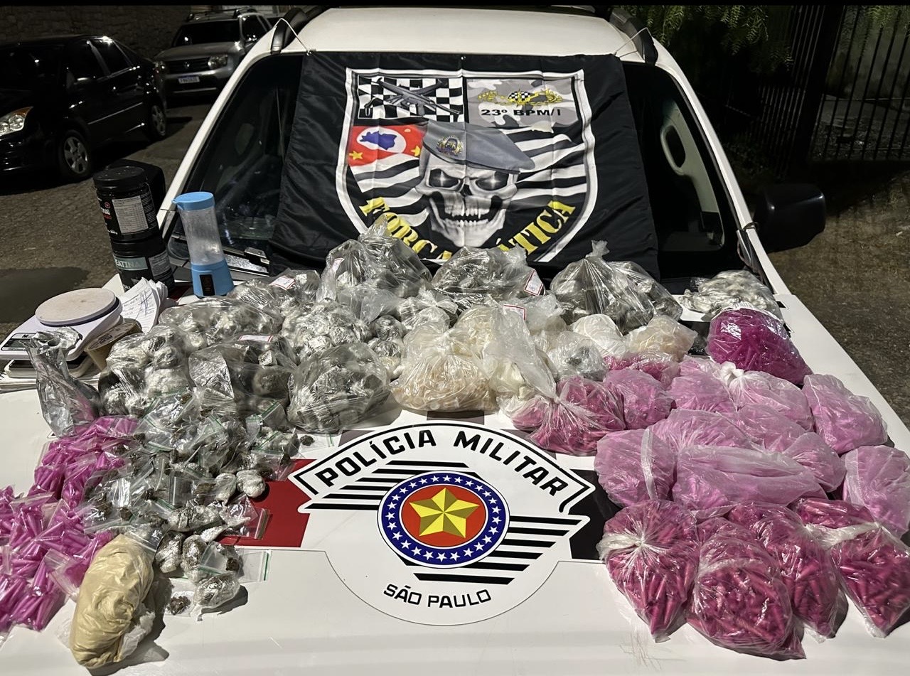 Também foram localizados um liquidificador, duas balanças de precisão, um caderno com anotações relacionadas ao tráfico e diversos materiais utilizados para o preparo e embalo das substâncias.